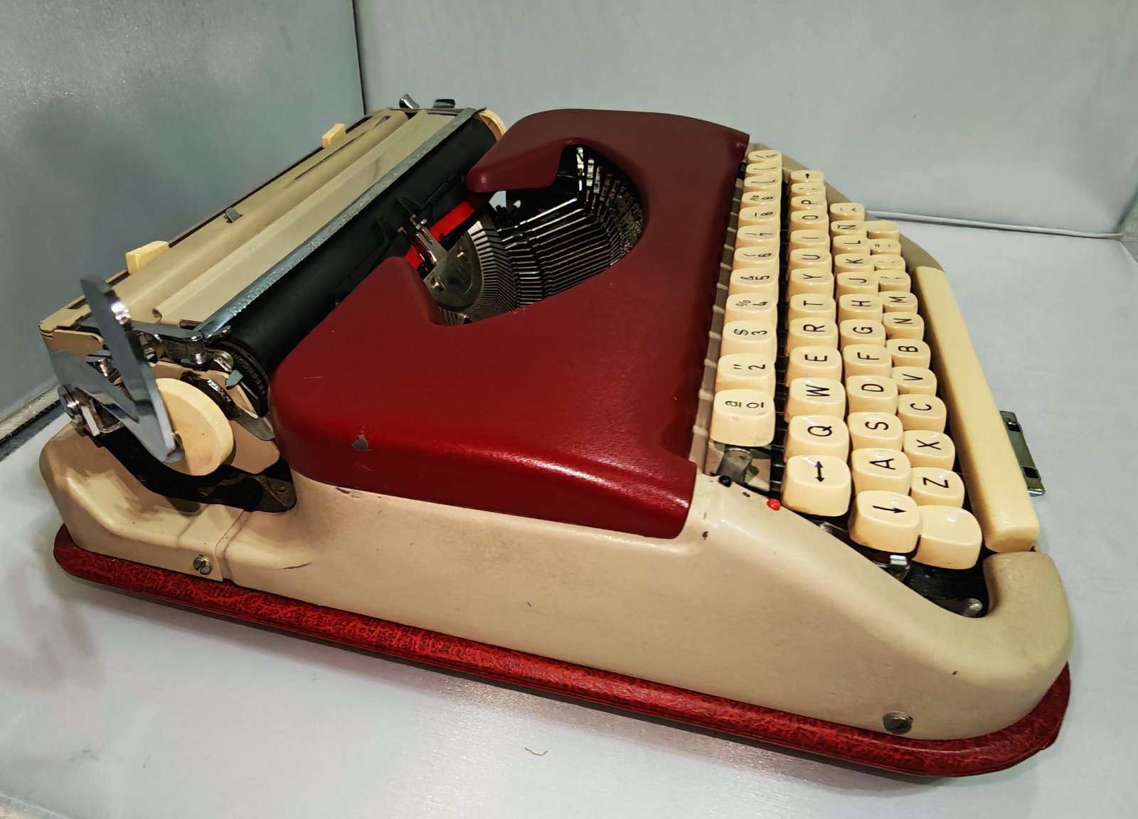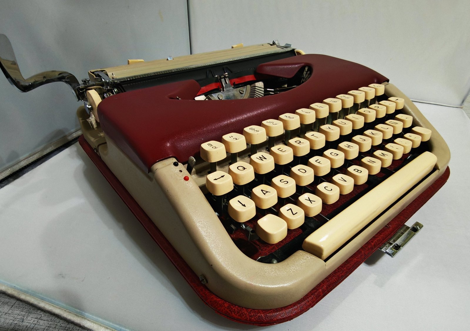 The Maritsa 11 is a true gem of Bulgarian mechanical design, manufactured by Typewriters Works (Bulgaria) during the 1960s. This model combines a solid all-metal structure, an elegant two-tone burgundy and cream finish, and precise mechanics — ideal for both typing and display.