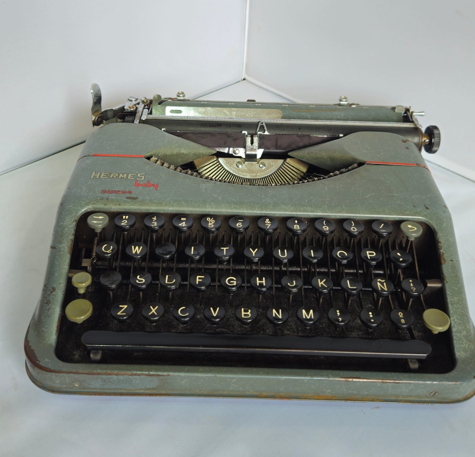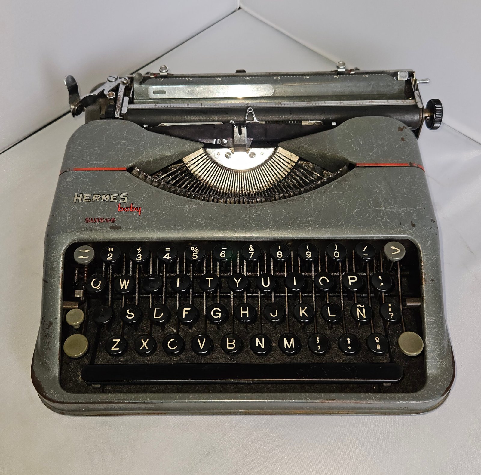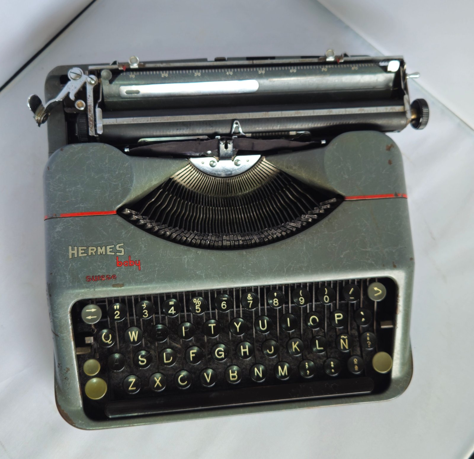 Este ejemplar conserva la estética clásica de la época: carcasa metálica en tono gris verdoso, teclas redondas negras y un diseño sobrio de líneas suaves. La presencia del logotipo Hermes baby – Suisse confirma su origen y pertenencia a las primeras series históricas del modelo.