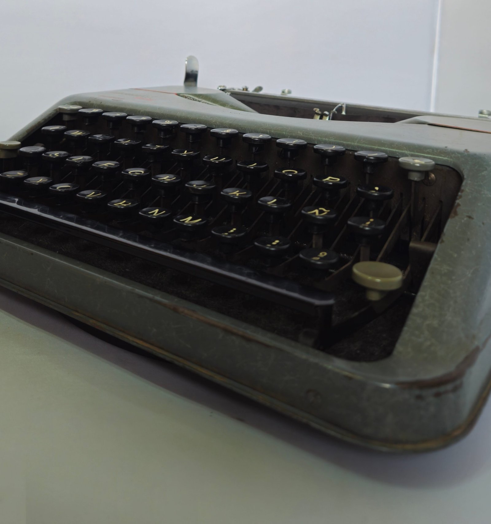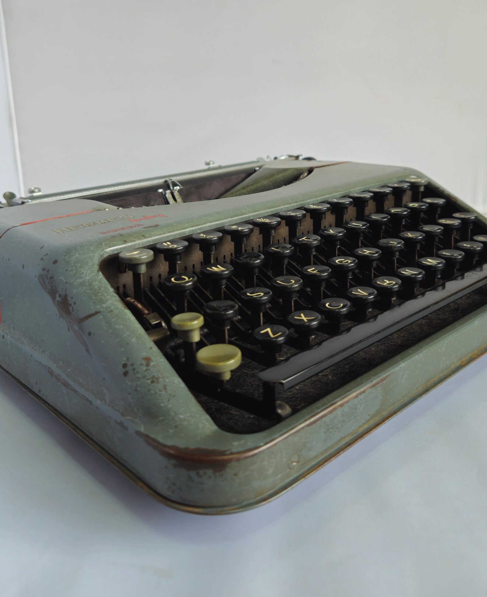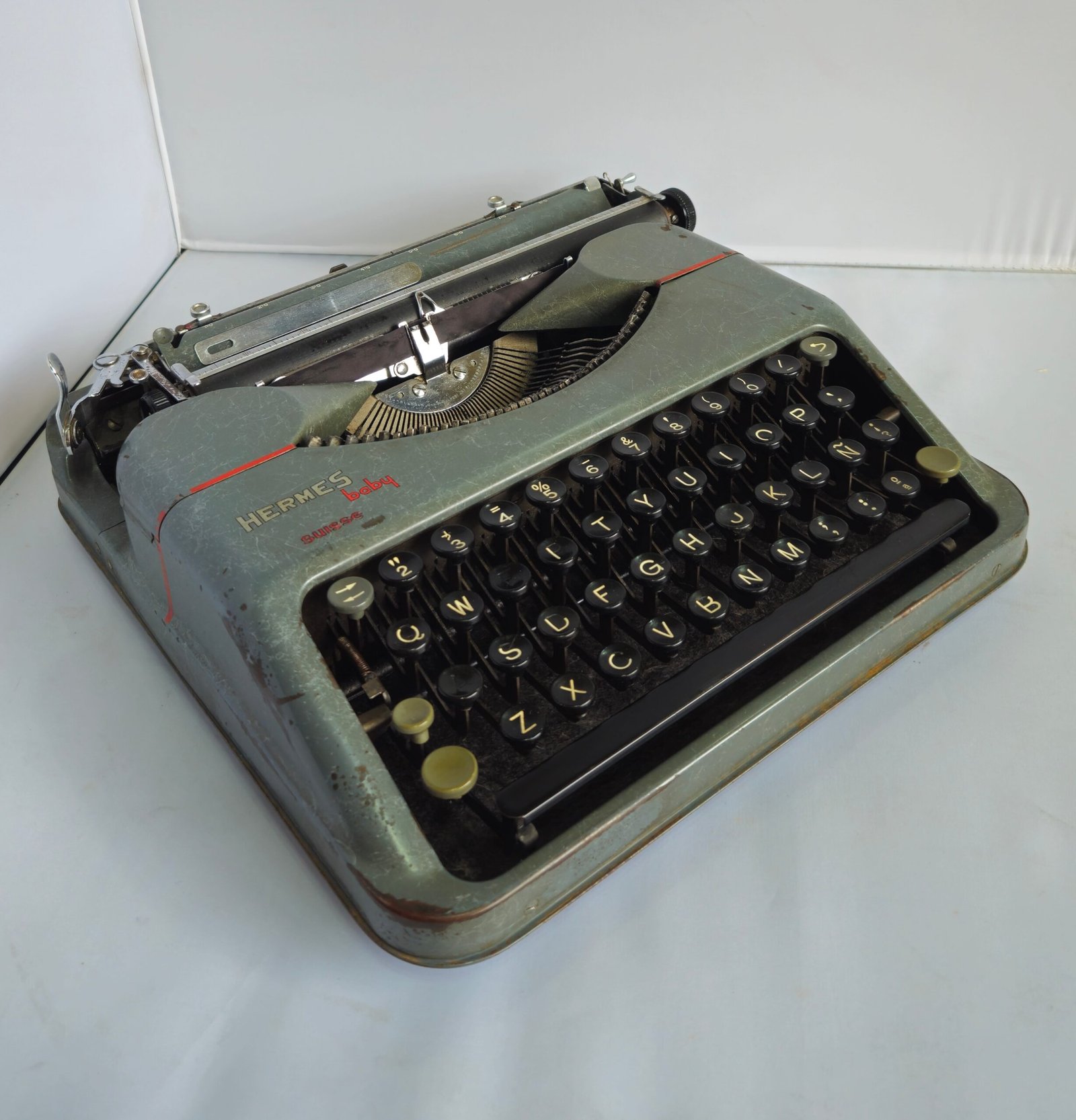 Este ejemplar conserva la estética clásica de la época: carcasa metálica en tono gris verdoso, teclas redondas negras y un diseño sobrio de líneas suaves. La presencia del logotipo Hermes baby – Suisse confirma su origen y pertenencia a las primeras series históricas del modelo.